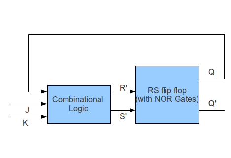 You are given a master slave RS flip flop made from NOR gates. Using this, design a circuit which behaves like a JK flip flop. The design can be like this :